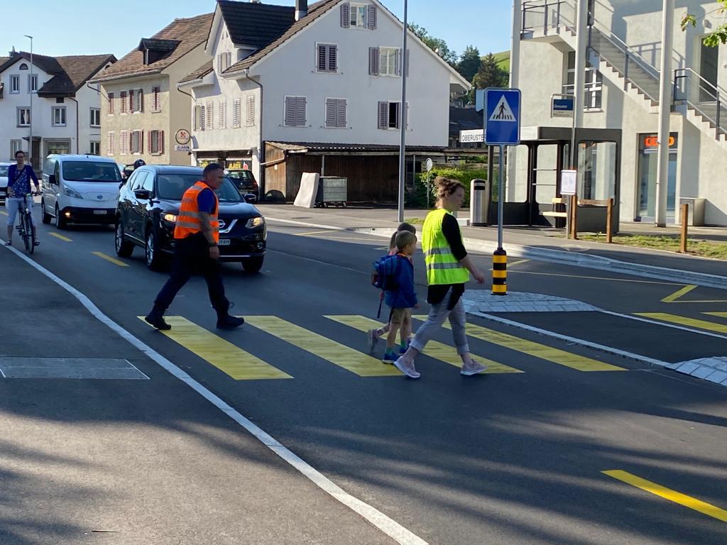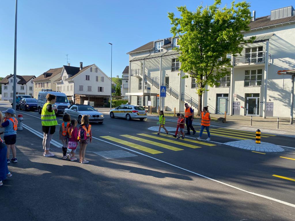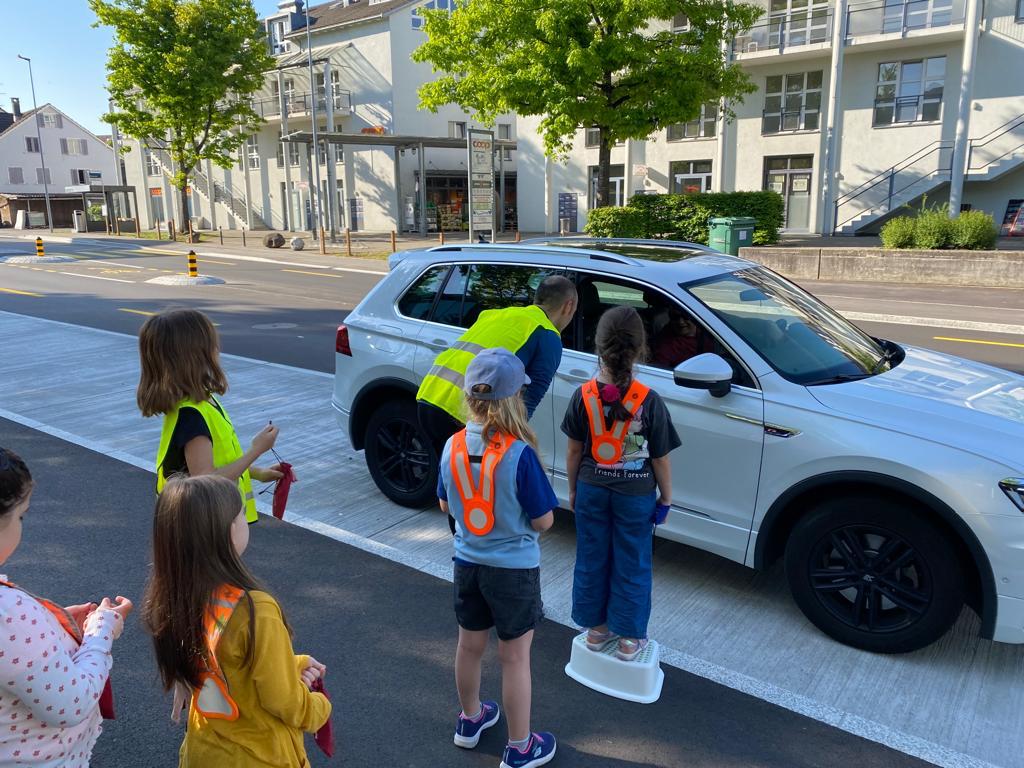 Die Autofahrer werden während eines Vormittags auf den Schulweg resp. die Fussgängerüberquerung sensibilisiert. Etwa 15 Kindergartenkinder wirken mit. Autofahrer werden angehalten und auf die Bedeutung des Themas „Rad steht – Kind geht“ aufmerksam gemacht.